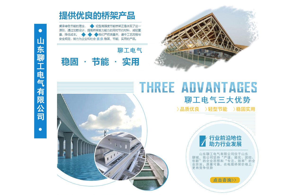 山東聊工電氣有限公司位于山東聊城,是一家銷售各類橋架的公司,公司主營鍍鋅防火噴塑橋架,鍍鋅防火電纜橋架 ,不銹鋼電纜橋架,熱浸鋅電纜橋架,鋁合金電纜橋架,熱鍍鋅電纜橋架,梯式電纜橋架等我公司堅持“嚴謹、踏實、團結、創新”的企業思想和“專注、效率”的企業宗旨,質量可靠,在電纜橋架價格上更有競爭優勢。公司追求品質,配有研發人員,進行產品的改革和創新,服務先進走出了一條富有企業特色的可持續化發展之路!    我公司鄭重向你承諾:保證最好的質量,以低的價格,完善的售后服務,來答謝新老客戶。可提前電話聯系。...